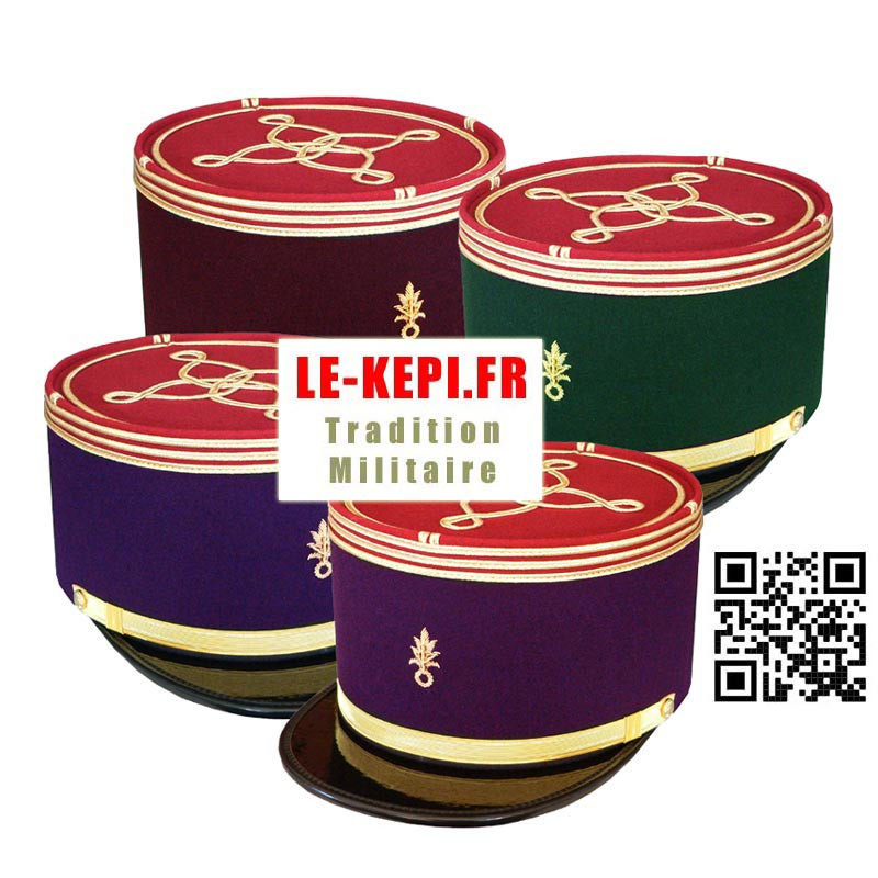 kepi médecin militaire LIEUTENANT-COLONEL, tour du képi velours cramoisie, dessus drap amarante, trèfle triple Or, 5 soutaches Or panachées argent, jugualire trait Or, sans broderie.